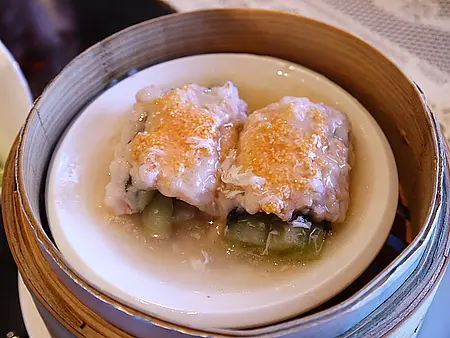 絲瓜切成條狀先包一層紫菜 外層再用花枝漿包裹住 上頭是滿滿的魚卵