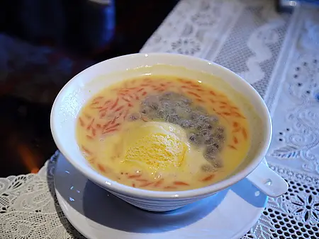 內有一球芒果冰淇淋 許多新鮮的紅柚果粒 另還加了些山粉圓