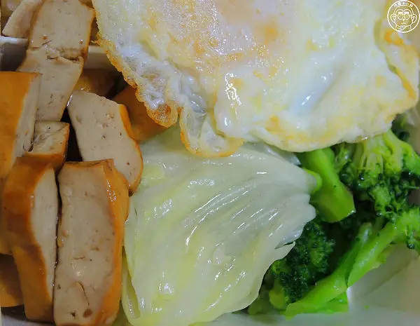 便當的固定菜色是高麗菜、花椰菜、蛋、豆干(有時會問蛋要荷包蛋還是菜脯蛋)