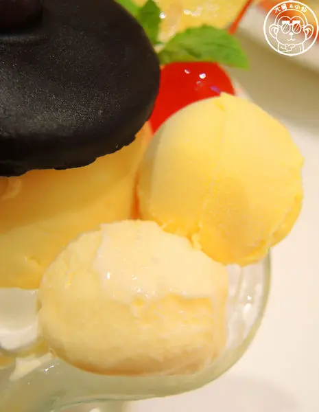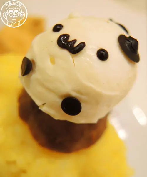 香草冰淇淋用巧克力做出表情與帽子,底部還有吃起來像粉粿的配料