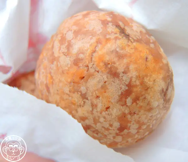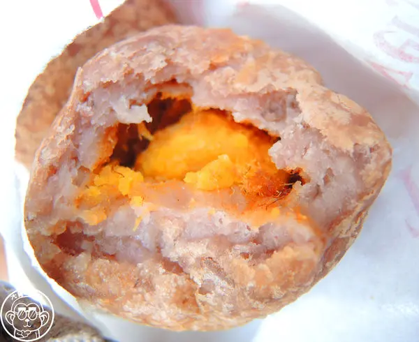 看著老闆用冰淇淋勺將芋泥挖成圓球狀,包入鹹蛋黃與肉脯後下鍋油炸