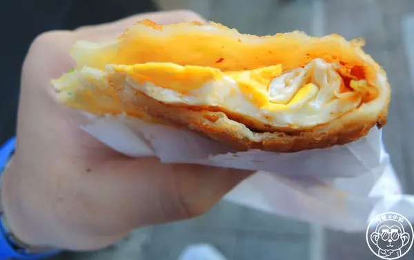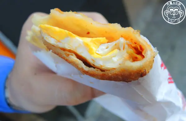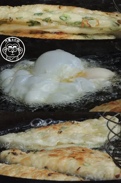 他們是直接打蛋進油鍋,待蛋膨起來後放到蔥油餅上面,對折蔥油餅後起鍋