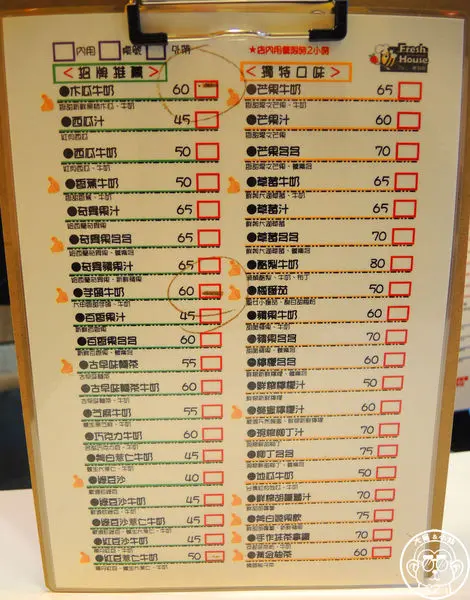 弗列斯有賣新鮮水果現打果汁及炭烤吐司,還有鬆餅與炸物(品項多到要分成兩張劃單)