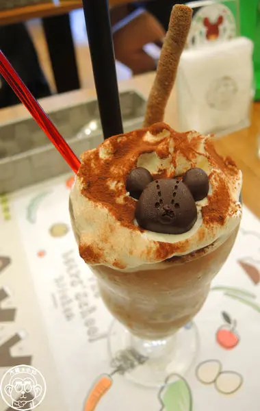 胡桃布朗尼奶昔(130元)飲品上頭有一塊小熊頭造型黑巧克力