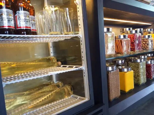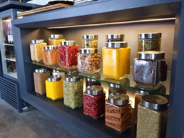 門口罐內五顏六色裝的是製作咖哩時會用到的部份香料,辣椒、薑黃、肉桂、月桂葉、荳蔻等 -