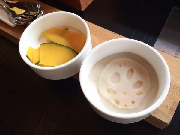每份咖哩都有搭配漬物小菜,黃黃的是南瓜片、下方為蓮藕片 -