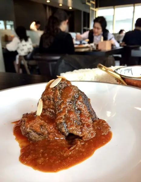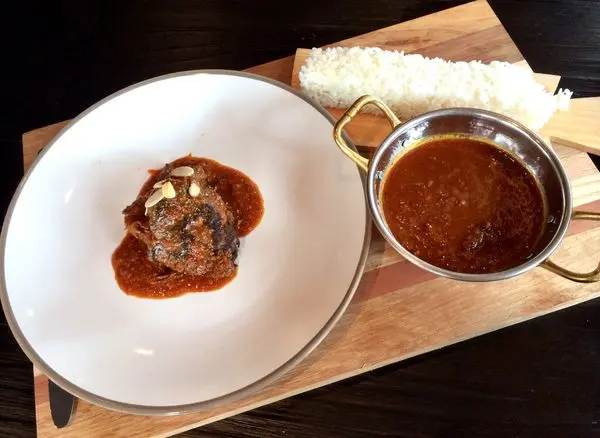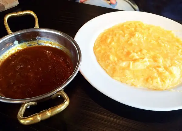 一旁附上更多的咖哩醬汁可以大力淋在飯上食用。
