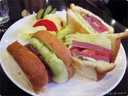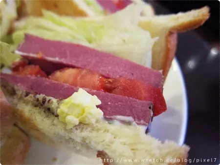 等待的時間沒太久餐點就陸續上桌,這是朋友的燻牛肉三明治(150),除了切分成三大塊的三明治外旁邊還附上蛋沙拉與生菜,份量滿點,吐司麵包中夾著兩層厚厚的燻牛肉和生菜,燻牛肉雖厚但口感十分軟嫩!