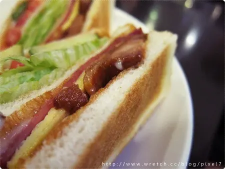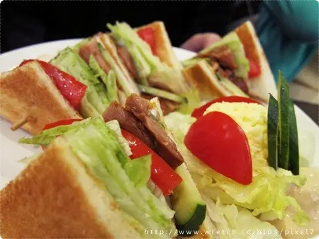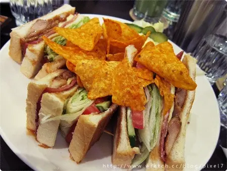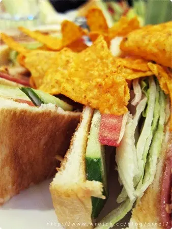 我的總匯三明治(150),除了一樣附上蛋沙拉和生菜之外,上面還多了一大把的多利多茲,份量十足驚人,烤過的吐司裡面夾上雞肉、火腿、蛋、生菜、蕃茄和小黃瓜,配上甜甜的美乃滋,是我最愛的豐富搭配。