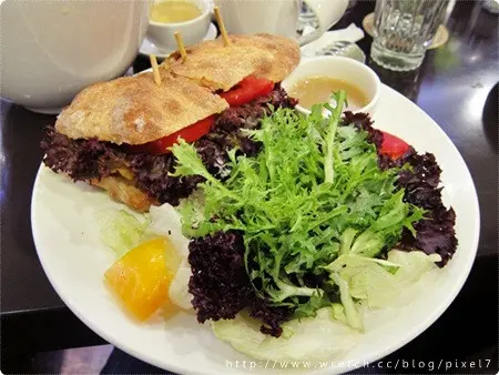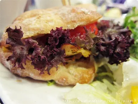 嫩煎香草雞肉巧巴達(160),這道等待比較久才上桌,附上的沙拉比較特別,沙拉醬汁略酸,巧巴達的麵包比起吐司更有嚼勁,推薦給喜歡口感的人,朋友說這道也好吃!