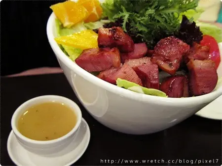 燻鴨羅蔓沙拉佐香橙(150),份量頗大,除了大量蔬菜外加上柳丁和鴨肉,深色的生菜較苦,燻鴨切成塊狀,柔軟又不失口感,好吃!搭配的沙拉醬是柳橙口味的,微酸很清爽。