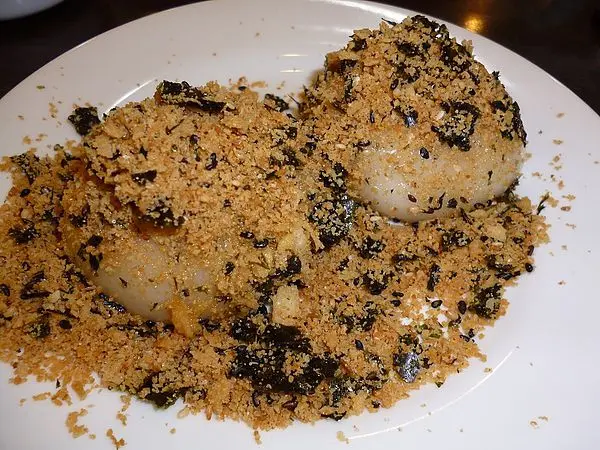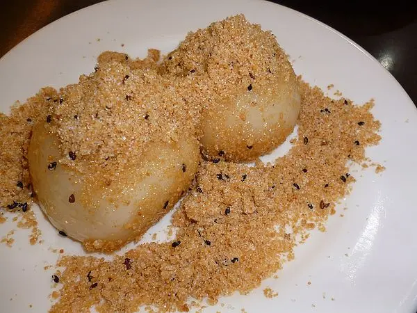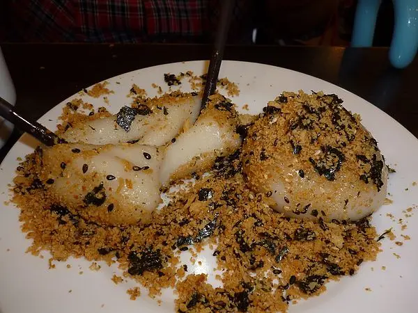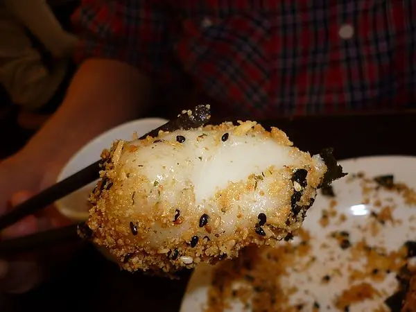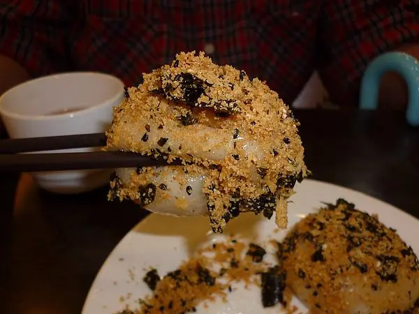這裡的燒麻糬裡面沒有任何餡料,剛上桌雖然只是兩顆單純的麻糬,但因為外層灑上海苔,素肉鬆,花生粉,黑芝麻,整体看起來相當澎湃華麗,挾一塊燒麻糬,試試看他的口感,雖然裡面沒有餡料,但吃起來有一種Q彈韌勁,隨著口腔的咀嚼,呈現麻糬自然的糯米風味,外層的海苔和素肉鬆,讓麻糬吃起來的口感帶著海苔和鹹酥的滋味.
