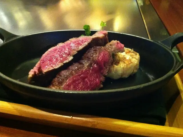 而這肉質鮮甜軟嫩的牛排~不論是搭上旁邊的蒜或者..