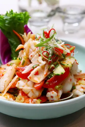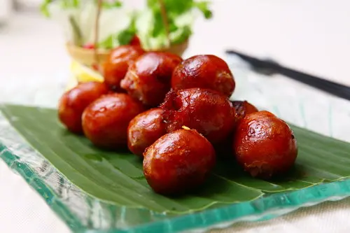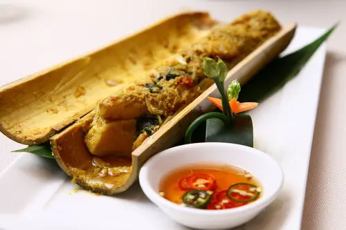 同樣塞在竹筒裡的藍斑魚,看起來貌不起眼,但卻夭壽好吃!那藍斑魚肉嫩而略帶彈性,吸了飽飽的香料風味,再沾上一點魚露吃,連胡姊吃到冷掉的魚肉都忍不住大讚真是美味!
