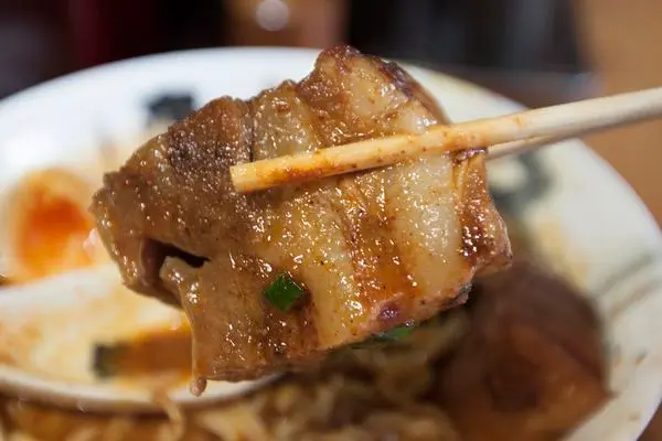 雖然上頭滿滿辣粉是主角,但目光很難不去注意到一旁肥滋滋兩大塊滷豬肉。
