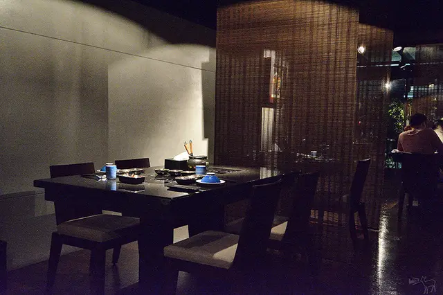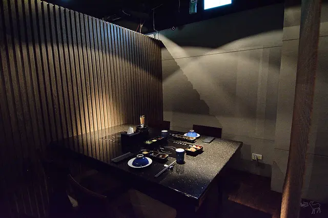 店內燈光較為暗色系且無太多繁雜花俏的裝飾,並使用日式簾幕。