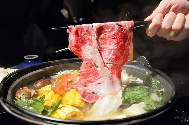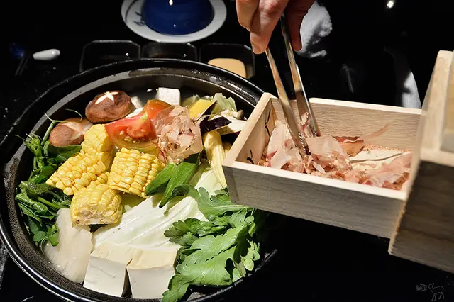 在蔬菜、湯鍋上桌後,只見服務人員拿起一個長型木盒,將木盒內的柴魚片放入湯鍋中增加風味,不得不說這樣的方式很特別。