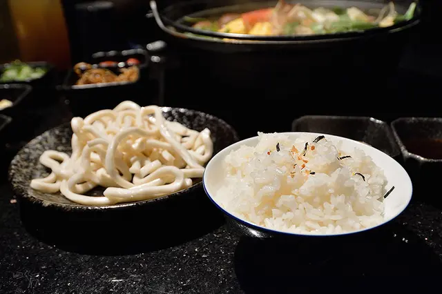 副餐可以選擇白飯或是烏龍麵,當日白飯煮的不夠透,所以吃起來有點乾且無彈性。