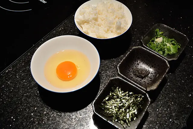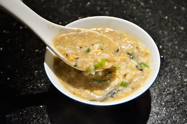 最後,店內人員幫我們撈取鍋內的殘渣,加入米飯下去熬煮多時,之後加入蔥花、松露醬、蛋、海苔成為雜炊粥,吃起來香且不錯吃。