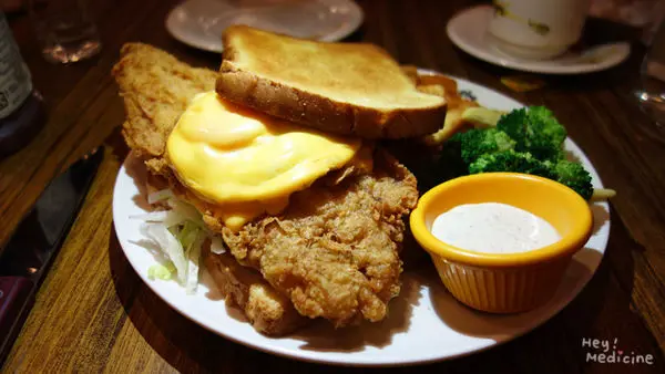這道菜的發想是英國的Fish & Chips,再加上一顆水波蛋,和厚厚的一層切達起司。當然中間還有生菜和番茄,不過他們似乎不是主角了哈哈。