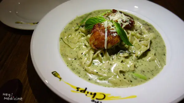 熱奶油鹽煎干貝蘿勒寬捲麵($390)