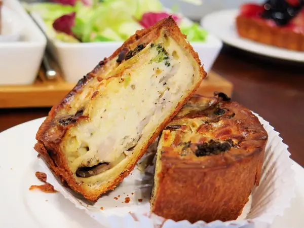 從鹹派外頭就能看到點綴其中的菇類與烘烤後香酥欲裂的塔皮