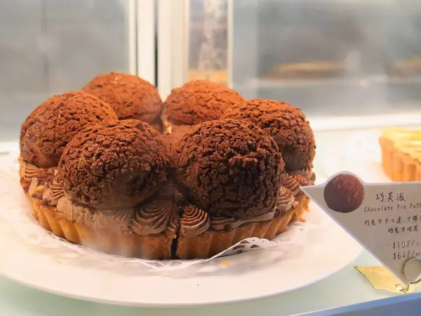 簡言之就是巧克力派+一球巧克力泡芙、香草派+一球香草泡芙