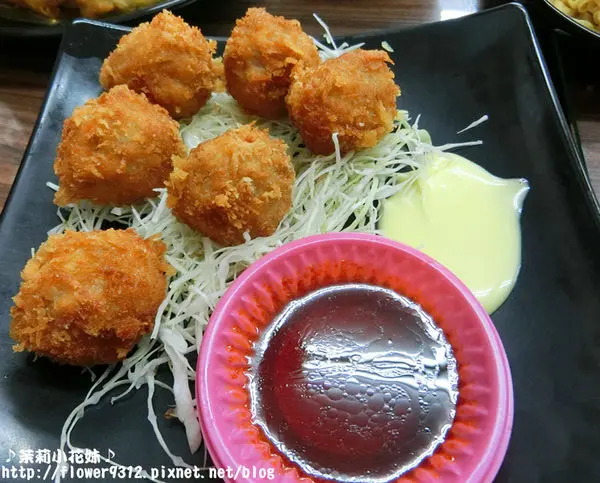 起司肉球($120):因為我們太不知要選什麼口味,所以老闆人超好的說,就各用一半給我們,所以給我們韓式酸辣、蜂蜜芥末~