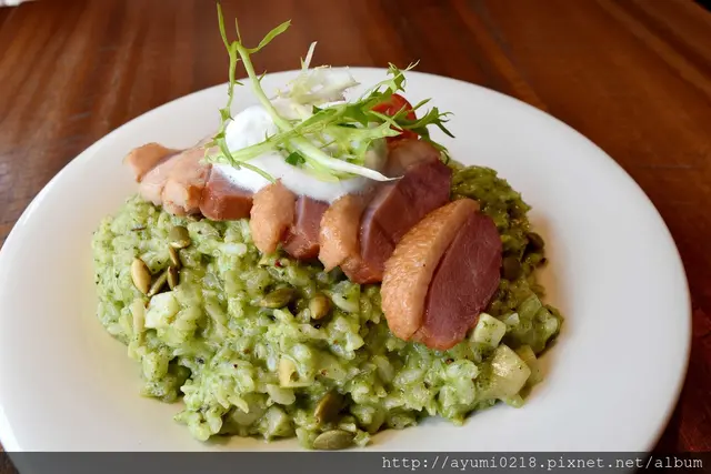 圓盤上頭漂亮的青醬燉飯.裏頭有松子跟杏鮑菇丁