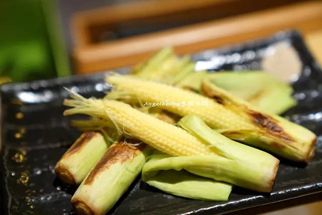 帶皮玉米筍烤到外表金黃帶點焦香、裡頭的玉米熟度洽好,一點胡椒提出甜度