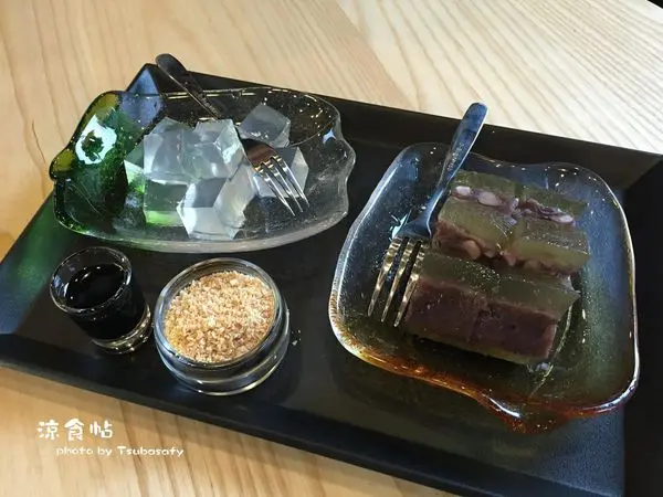 上桌的涼菓子很精緻,小小盤的果然是小點。與台灣的涼糕吃起來口味略有不同,口感稍硬抹茶紅豆吃起來口味不會太甜膩。