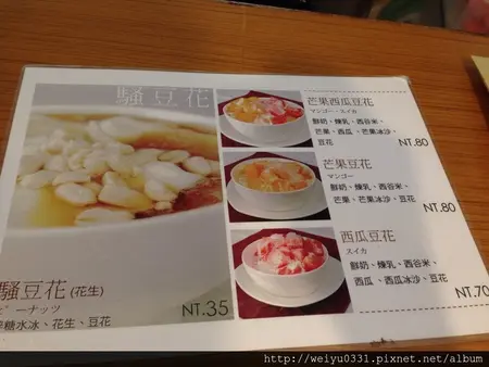 這家豆花店可說是冬暖夏涼,冬天有一些紅豆、山藥、芝麻糊豆花,不過畢竟現在是夏天,所以就你們一些比較清爽的選擇。