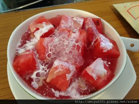 真是料滿又超實在,西瓜很甜加上西米露的咕溜,口感很意外,然後把豆花拌在西瓜冰沙裡面,很爽!!!