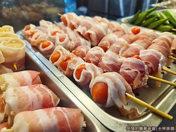 燒烤攤較少見的創意串燒食材,像是〝番茄肉捲〞、〝金針菇肉捲〞、〝培根麻糬〞...等。