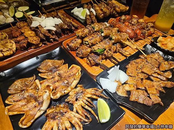 豬五花金針菇串、魷魚、牛肉串、豬肉串、山豬肉香腸、雞腿捲、雞心、培根麻糬、烤麻糬、豆皮、糯米椒、青椒、茄子、絲瓜、杏鮑菇...等。
