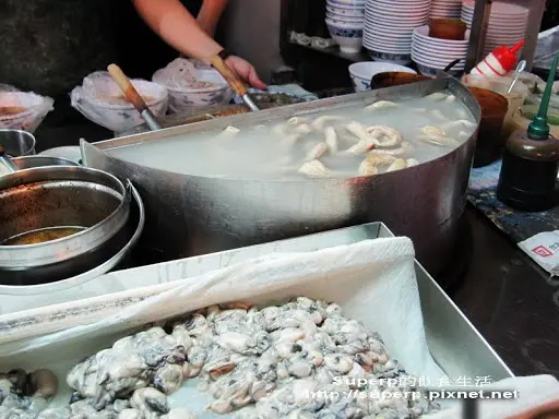 攤位上擺著一堆蚵仔和小腸,因為他們就是這兩樣銷量最大。