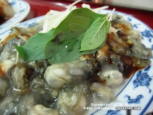 乾蚵$60 (蚵仔裹太白粉後燙過,淋上醬油膏&蒜泥,並放上薑絲去腥,九層塔來提味)