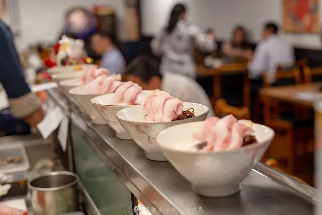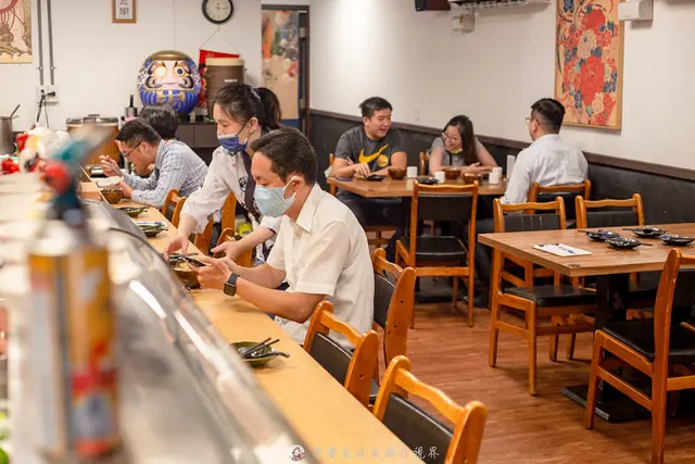 《大鵬壽司》營業時間是從12點到14點半,中間有餐間休息時間,接著是晚上17點半到20點半,周一是公休日可別白跑了,12點到的時候,《大鵬壽司》店裡面已經有三四桌的客人,然後師傅在吧台上幾乎是沒有停手,一整排的丼飯要做,看起來單就很多,等到朋友到的時候,整家店幾乎是8~9成滿,平日中午這樣生意真的很好,後來有一次還要候位20分鐘。