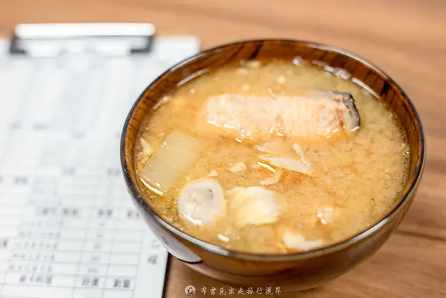 隨丼飯跟定食都有附上一碗味噌湯,味噌湯一上來覺得是不是送錯了,有一點太誇張了啊,裡面的魚肉幾乎都比湯還要多了,然後魚肉都是用上鮭魚,一般都是用邊角肉小小一塊而已,這邊直接給超大一塊的,朋友還說喝完湯之後就覺得飽了,真的有一種在海港或魚市場吃飯的豪邁感。