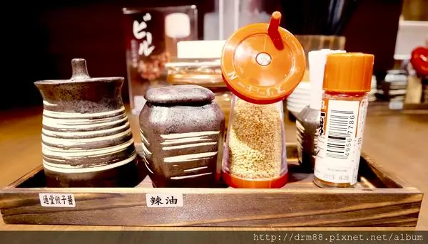 桌上有通堂餃子醬,辣油,芝麻粉,七味粉,