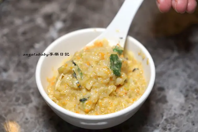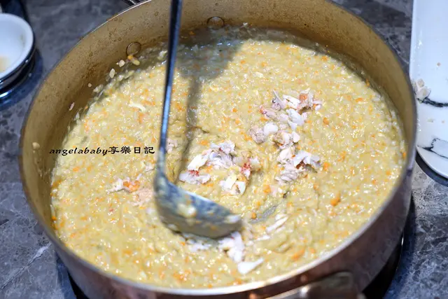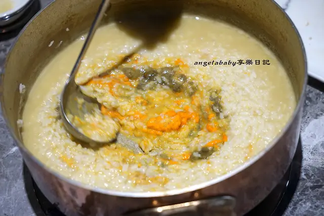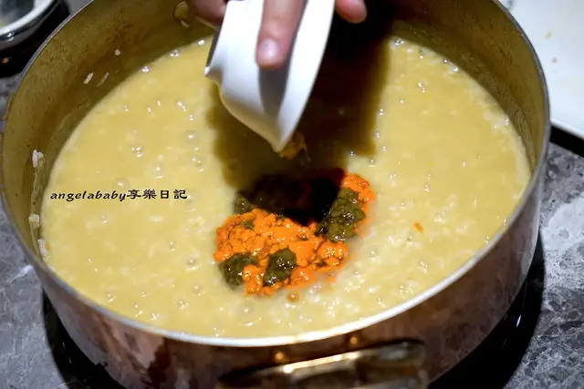 把最後的龍蝦肉拌入蟹膏粥中、奢華無比的精華煲粥