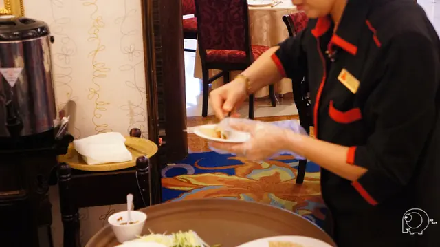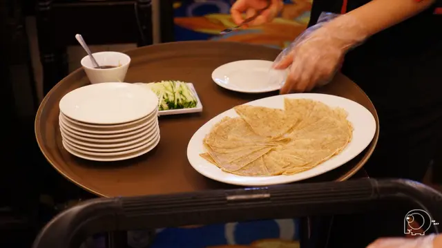 旁邊的服務人員也拿了餅皮、配菜跟甜麵醬