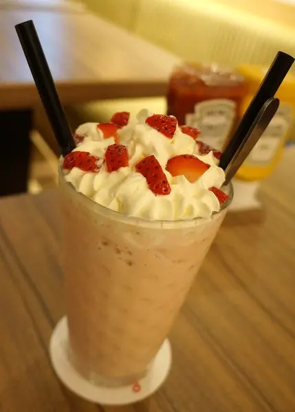 好喜歡這奶昔!還有上面的鮮奶油與草莓的裝飾好漂亮,份量也很夠,好想試試香蕉花生奶昔,一定也好棒!