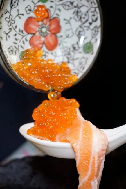 將一旁鮭魚卵豪不客氣的堆疊在鮭魚肚上頭,逼逼波波的鹹香滋味配上鮭魚肚豐富的甜,飽嘴的讓人不禁想咧嘴笑,這樣吃好滿足