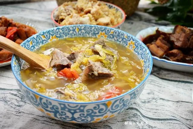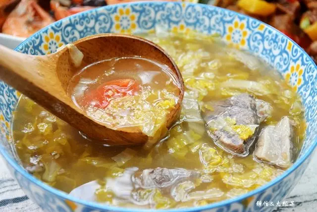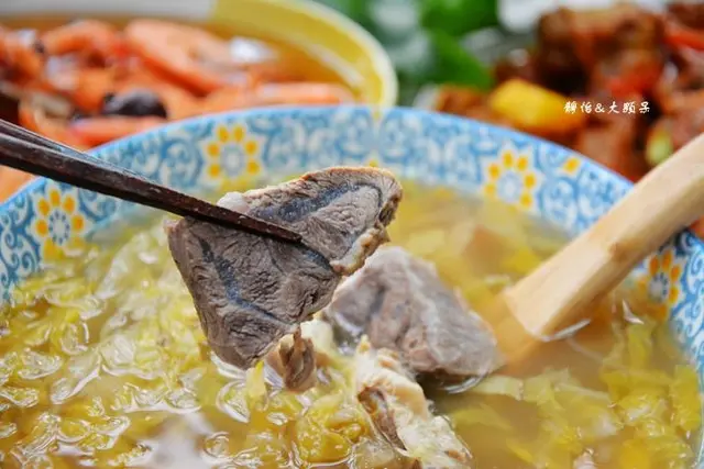 可以直接當湯喝也可以搭配麵食變成酸白菜牛肉麵,採用天然發酵的自製酸白菜,酸白菜及牛腩的份量都不少,牛腩很大塊,嫩口好咬、湯頭酸香開胃,讓人一喝就上癮的好味道
