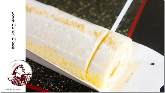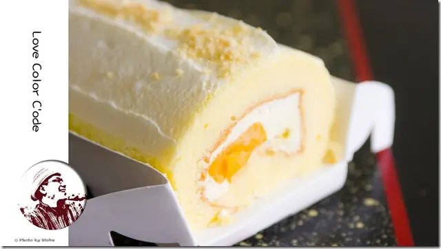 盒子左右兩邊有個提耳,可以很方便把整條芒果卡士達捲拿出,算是一個貼心的設計。一看到芒果卡士達捲的橫切面,奶霜的白包覆戚風糕,戚風蛋糕內在捲入卡士達醬,而產地直送的芒果就裝餡在卡士達裡,用料感覺非常實在。