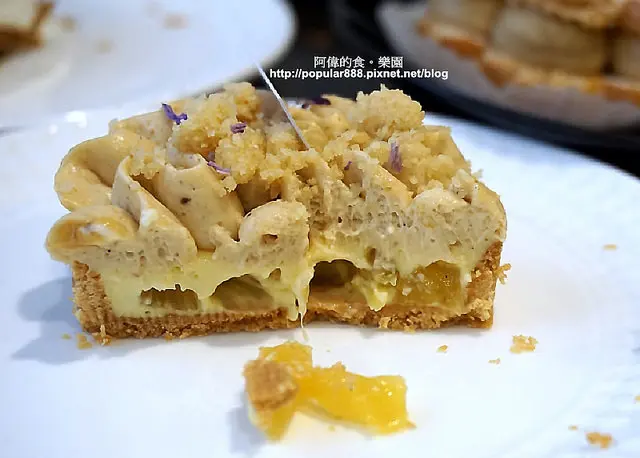 我愛極了它裡面的餡料,除了滿滿的"輕"卡士達醬,正中心還藏了一些"焦糖塊",這個東西偏甜,請注意!而底部的消化餅塔皮口味質感皆好,我給予很高的評價。