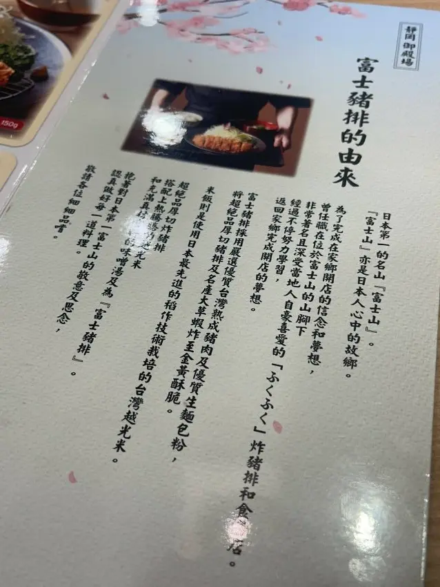 Ω一旁的工作區掛的牌子有稍微引起肥魯的好奇心,越光米應該是沒啥問題,因為台灣也有越光米,不過MENU上寫的富士豬排用的是嚴選台灣優質熟成豬肉,和日本國產的銘柄豚在概念上是不是可以同樣用台灣本地越光米的邏輯來等同認定(類似有引進銘柄豚在台灣飼養這樣),這個就超出肥魯外行人的認知範圍了XD