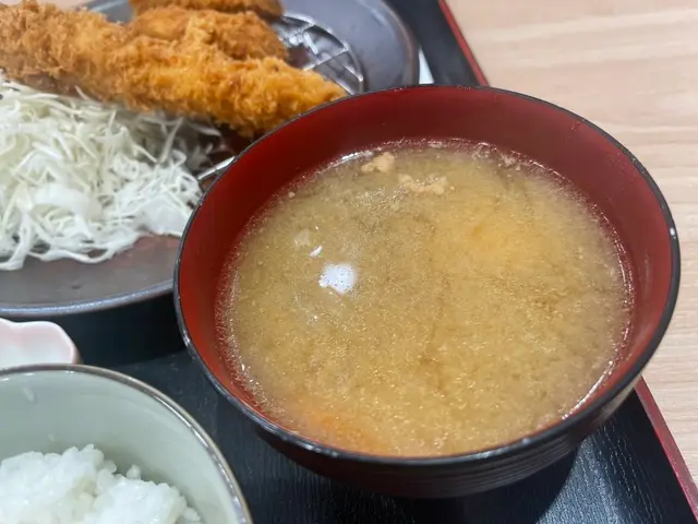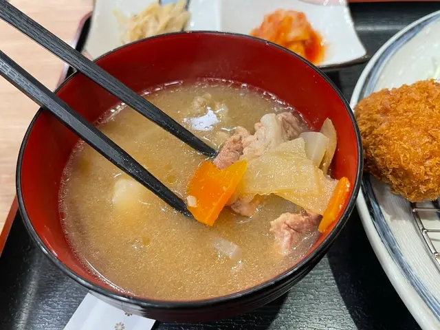 Ω味噌湯除了紅白蘿蔔還有豬肉片,湯味家常卻也不單調,平順耐喝~