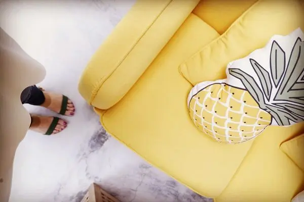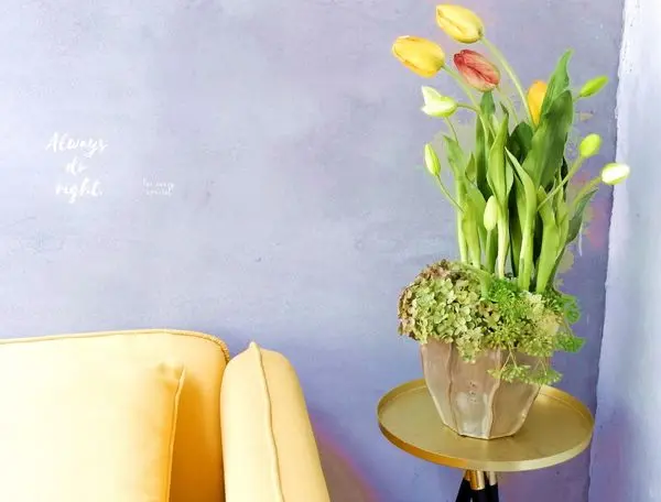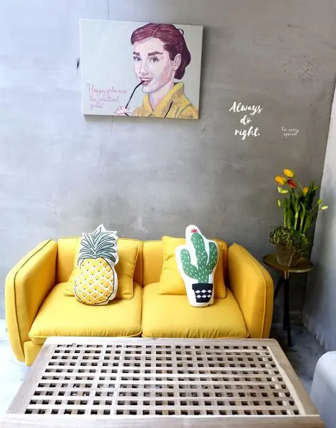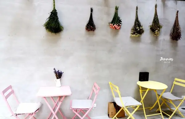 前方設計為輕食咖啡區域,灰白的水泥地磚與牆面搭配甜甜夢幻的桌椅,擺上粉色與黃色的小餐桌,乾燥花掛在牆上點綴,雖然簡單卻也非常好拍。說有多搶眼就有多搶眼,讓人整個少女心大噴發~